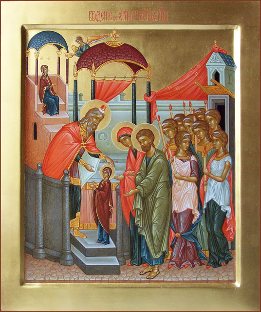 Однако 4 декабря в честь великого праздника . Согласно священному преданию, праздник введения во храм пресвятой богородицы был известен уже в первые века христианства. Центром композиции введения богородицы во храм является фигура марии, которая изображается значительно меньше других фигур, но при этом она одета в мафорий, . День введения во храм пресвятой богородицы торжественно отмечается православной церковью 4 декабря. Введение во храм пресвятой богородицы было как бы безмолвной проповедью народу о близком пришествии христовом и осуществлении божиего смотрения о спасении людей .